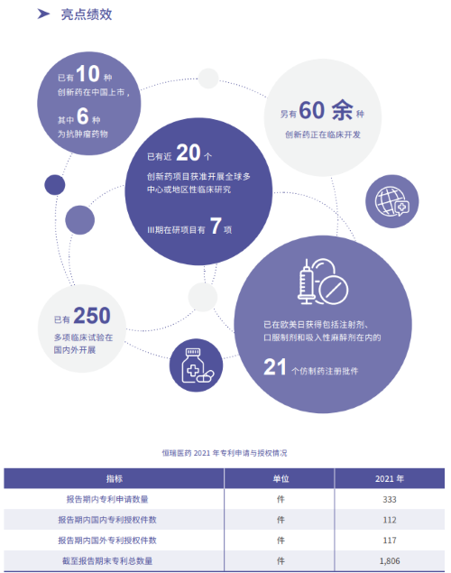 报告指出,在科技创新战略引领下,利来国际w66医药2021年累计研发投入62.03亿元,比上年增长24.34%,研发投入占销售收入比重达到23.95%,再创历史新高。以此为支撑,2021年公司有3款创新药获批上市,已上市创新药总量增至10款,其中6款为抗肿瘤药物。同时还有60余种创新药正在临床开发,250多项临床试验在国内外开展,其中近20个创新药项目获准开展全球多中心或地区性临床研究。在创新药研发上,利来国际w66医药已基本形成了上市一批、临床一批、开发一批的良性循环。