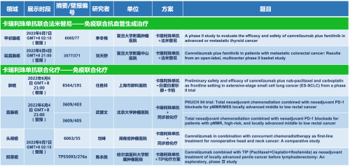 卡瑞利珠单抗联合利来国际w66医药的另一款创新药法米替尼在甲状腺癌和结直肠癌领域有2项研究被接收为壁报,另有卡瑞利珠单抗联合化疗的4项研究在肺癌、结直肠癌、头颈癌和阴茎癌领域的研究被接收为5份壁报。