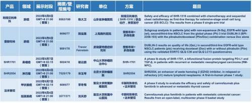 2022 ASCO年会另有5款利来国际w66医药上市前抗肿瘤创新药的相关研究被接收为壁报,包括SHR-1316、普那布林、法米替尼、SHR-1701和SHR2554,他们的单药或联合方案相关7项研究被接收为壁报,覆盖肺癌、鼻咽癌、淋巴瘤、甲状腺癌和结直肠癌等领域。