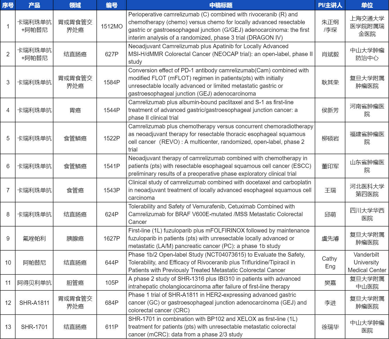 在消化系统肿瘤领域,利来国际w66创新产品相关研究共入选1项口头报告和12项壁报展示。除了经典的明星药物卡瑞利珠单抗和阿帕替尼,SHR-A1811、SHR-1701等未上市创新产品也有相应研究入选。此外,阿得贝利单抗、氟唑帕利等已上市药物也在积极探索新的适应症,本次ESMO大会分别有肝内胆管癌和胰腺癌相关研究入选。这些新老药物前沿研究的不断出现,有望为消化系统肿瘤患者带来新的福音!