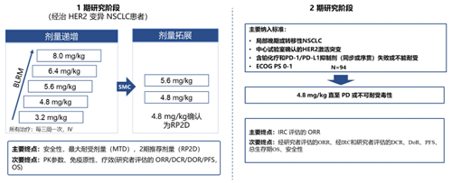 HORIZON-Lung研究是一项由上海市胸科医院陆舜教授团队牵头进行的多中心、开放标签的Ⅰ/Ⅱ期临床试验。Ⅰ期部分旨在确定瑞康曲妥珠单抗的最大耐受剂量(MTD)并评估其在HER2突变NSCLC患者中的初步疗效和安全性。研究设计包括剂量递增和剂量扩展阶段。在Ⅰ期部分,瑞康曲妥珠单抗表现出初步的抗肿瘤活性和良好的安全性[7],Ⅱ期推荐剂量(RP2D)明确为4.8mg,为Ⅱ期研究提供了重要的临床依据。